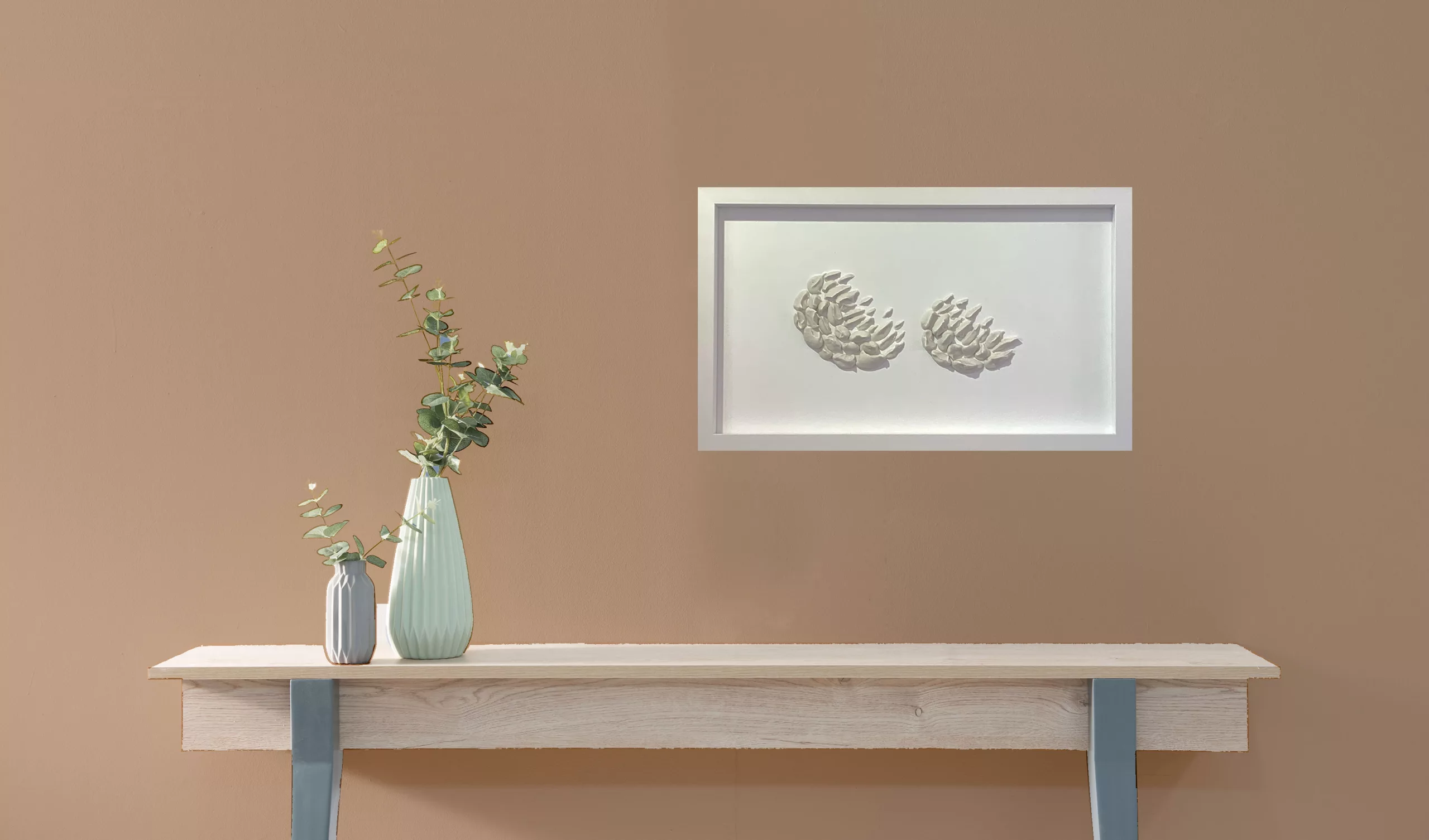 Formes de porcelaine sur panneau composite d'aluminium. Ce tableau d'une grand sobriété s'intègre parfaitement à tous les intérieurs contemporains ou campagnes. Le tableau est mis en valeur par un encadrement bois blanc à la finition lisse.