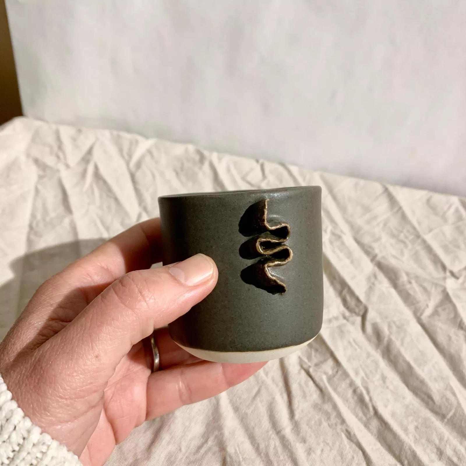 Tasse en grès blanc nappé d'un émaille mat. Sa surface lisse offre un touché doux et réconfortant, idéal pour savourer un café. Le pied de la pièce est laissé en terre brute ce qui donne un joli contraste avec l'émaille.