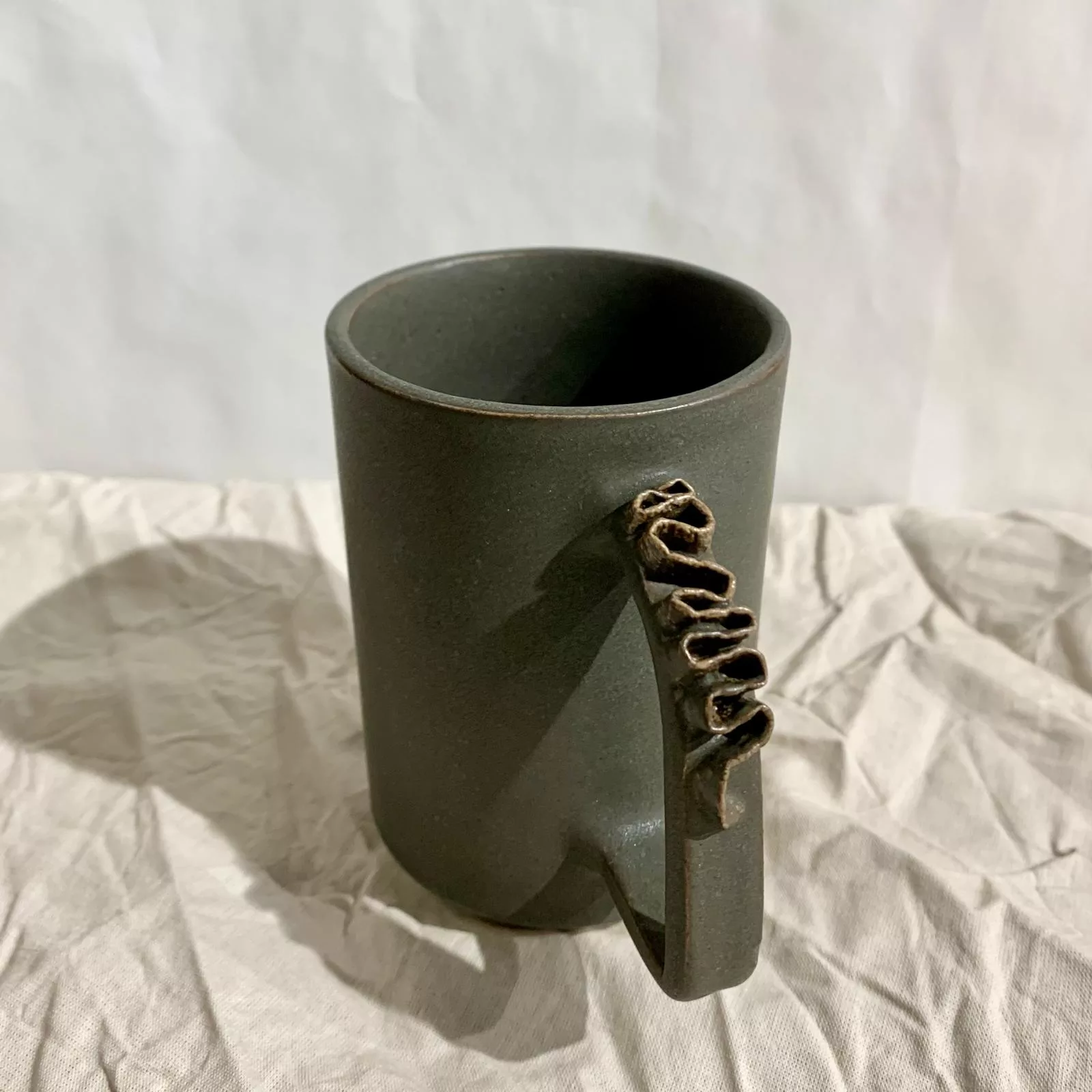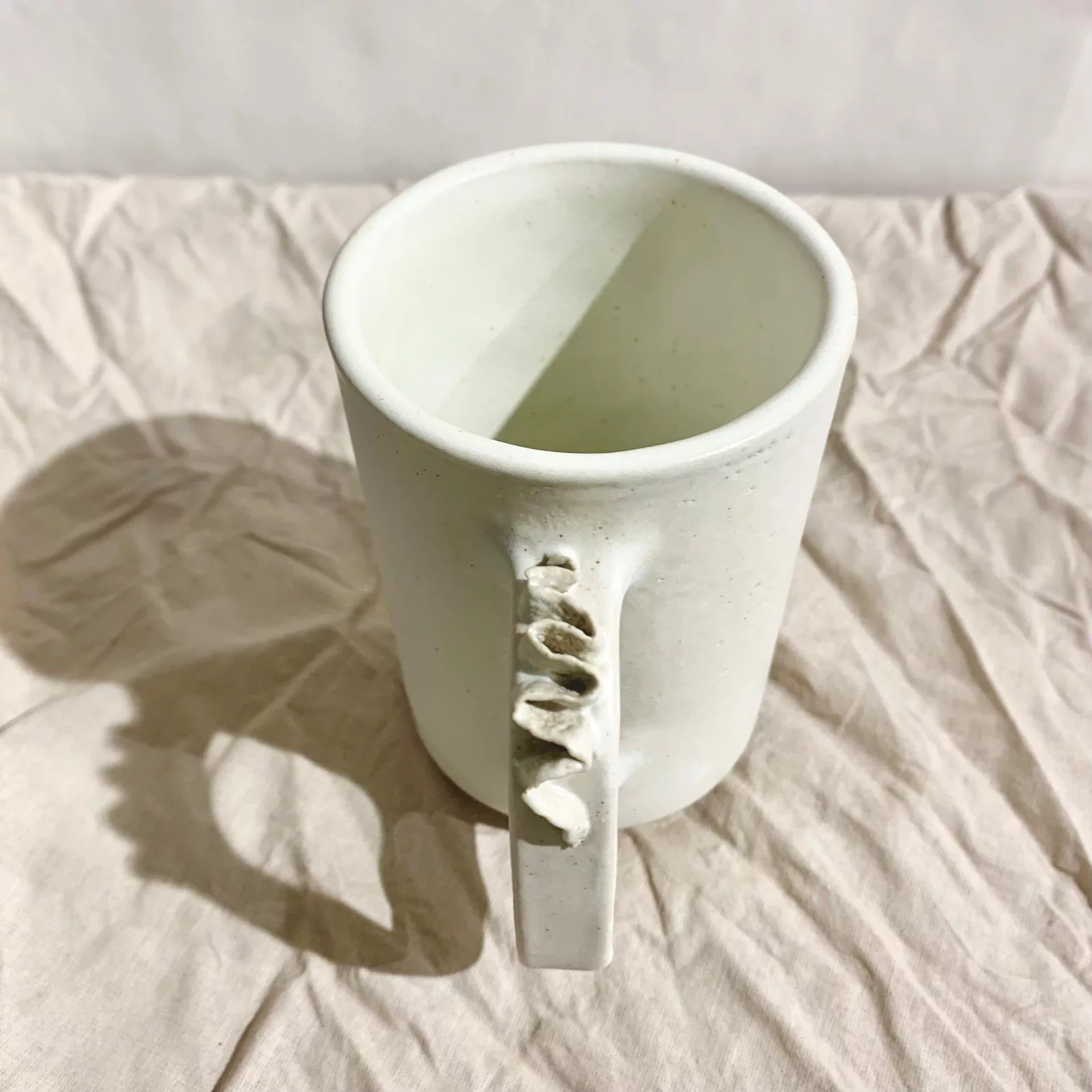Chaque tasse s’orne d'un froufrou façonné et posé à la main, petit ruban de terre ornant l'anse de la pièce.